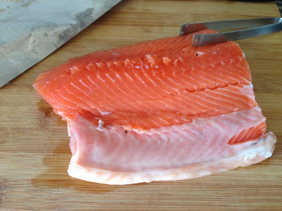 Una vez las brasas estén casi listas podemos comenzar a desespinar el salmón. Normalmente, cuando en la pescadería lo preparan lo suelen dejar bastante limpio, pero siempre quedan una linea de espinas en uno de los lados del lomo. Conviene quitarlas si queremos disfrutar el plato al 100%.