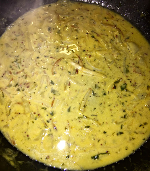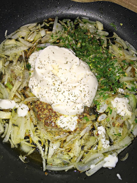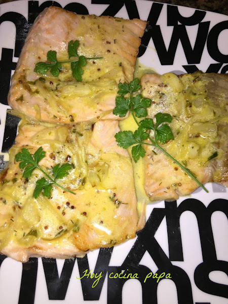 En la misma sartén vamos a pochar una cebolla picada en juliana (tiras finitas), con 3-4 cucharadas de aceite, a fuego medio para que vaya soltando todo su sabor. Cuando veamos que la cebolla está transparente le añadimos una cucharadita de mostaza de Dijón, un yogur natural, una cucharadita de eneldo picado y 100 ml de leche evaporad (o nata (crema de leche) si no hay problema con la dieta). Lo dejamos reducir 5 minutos a fuego medio.