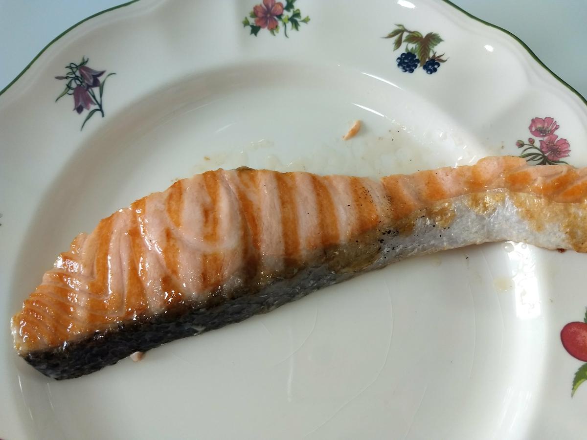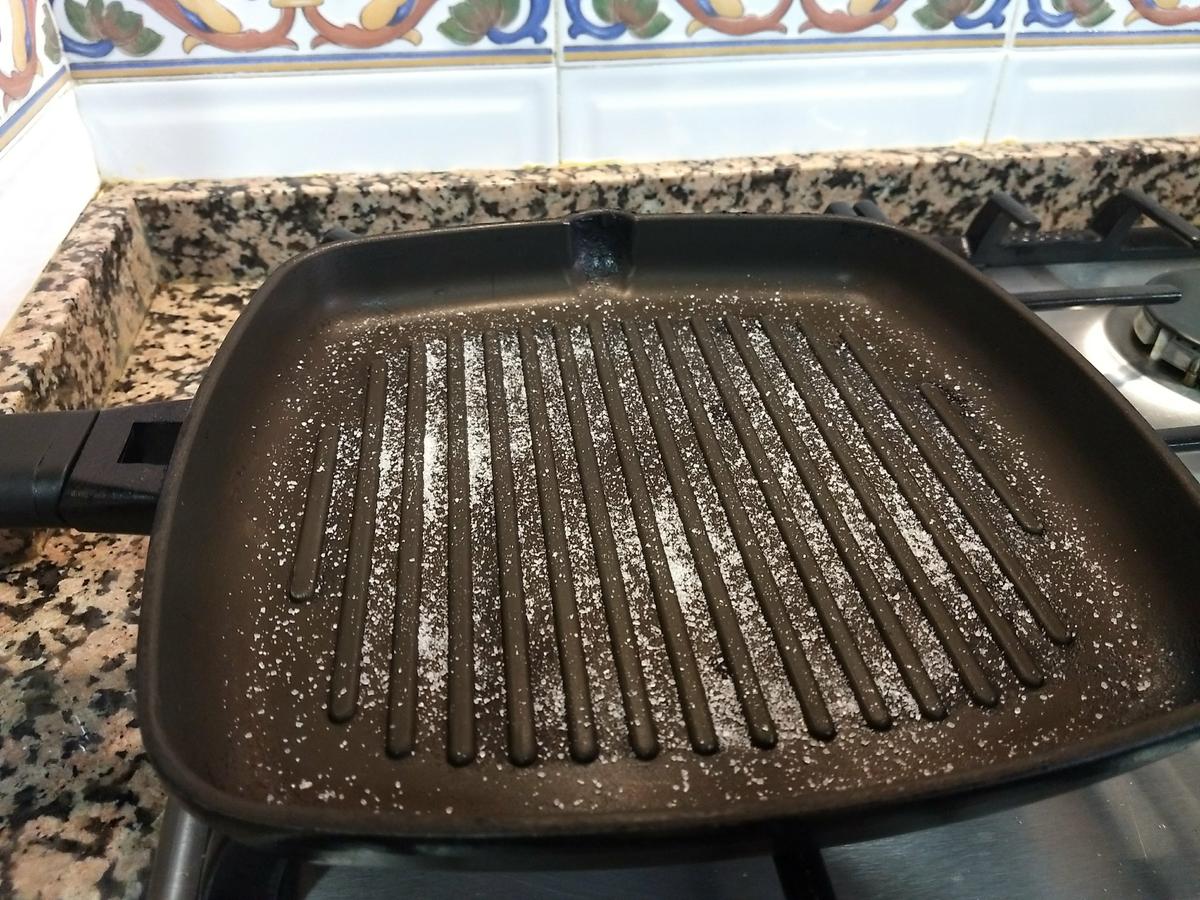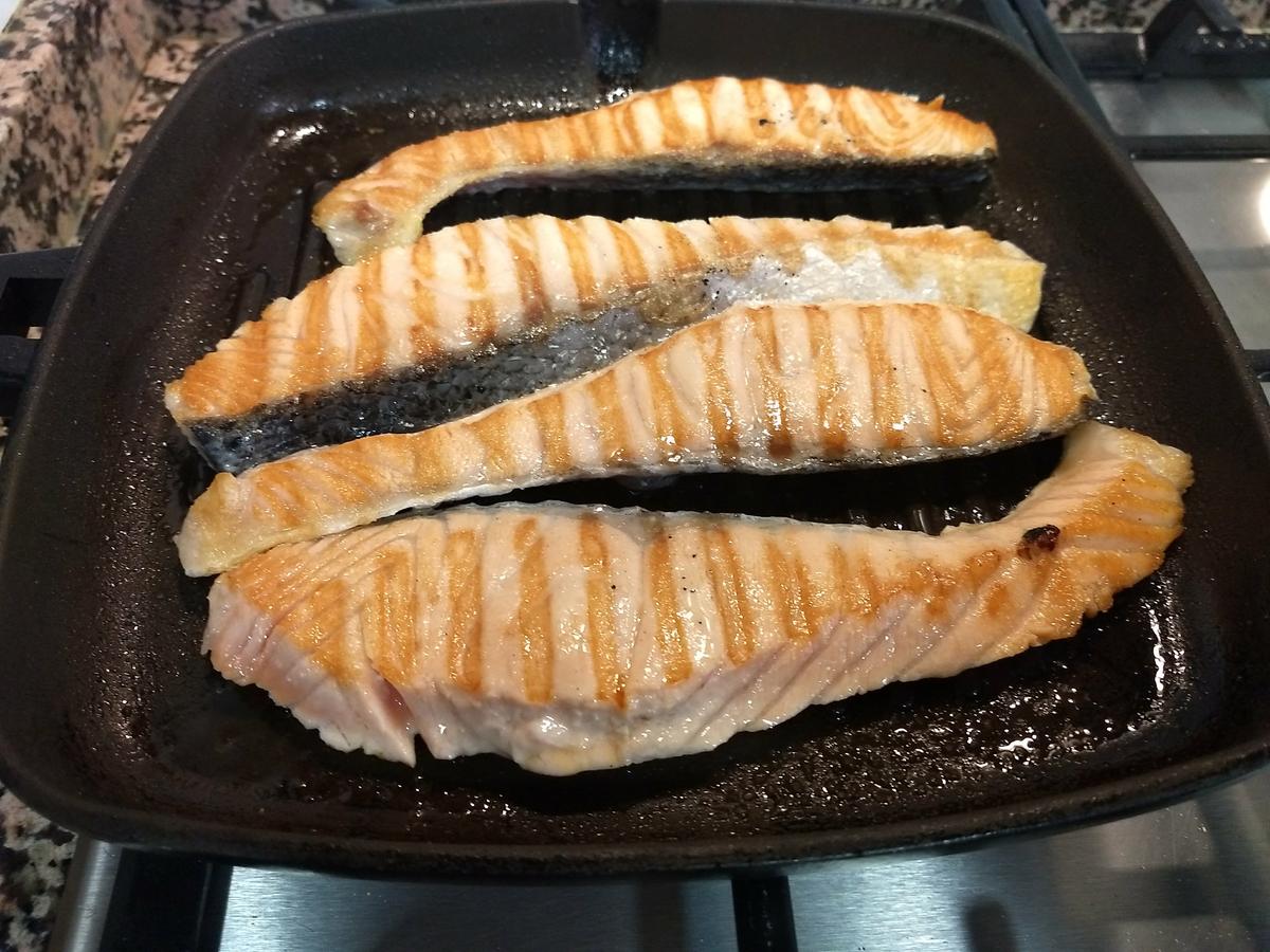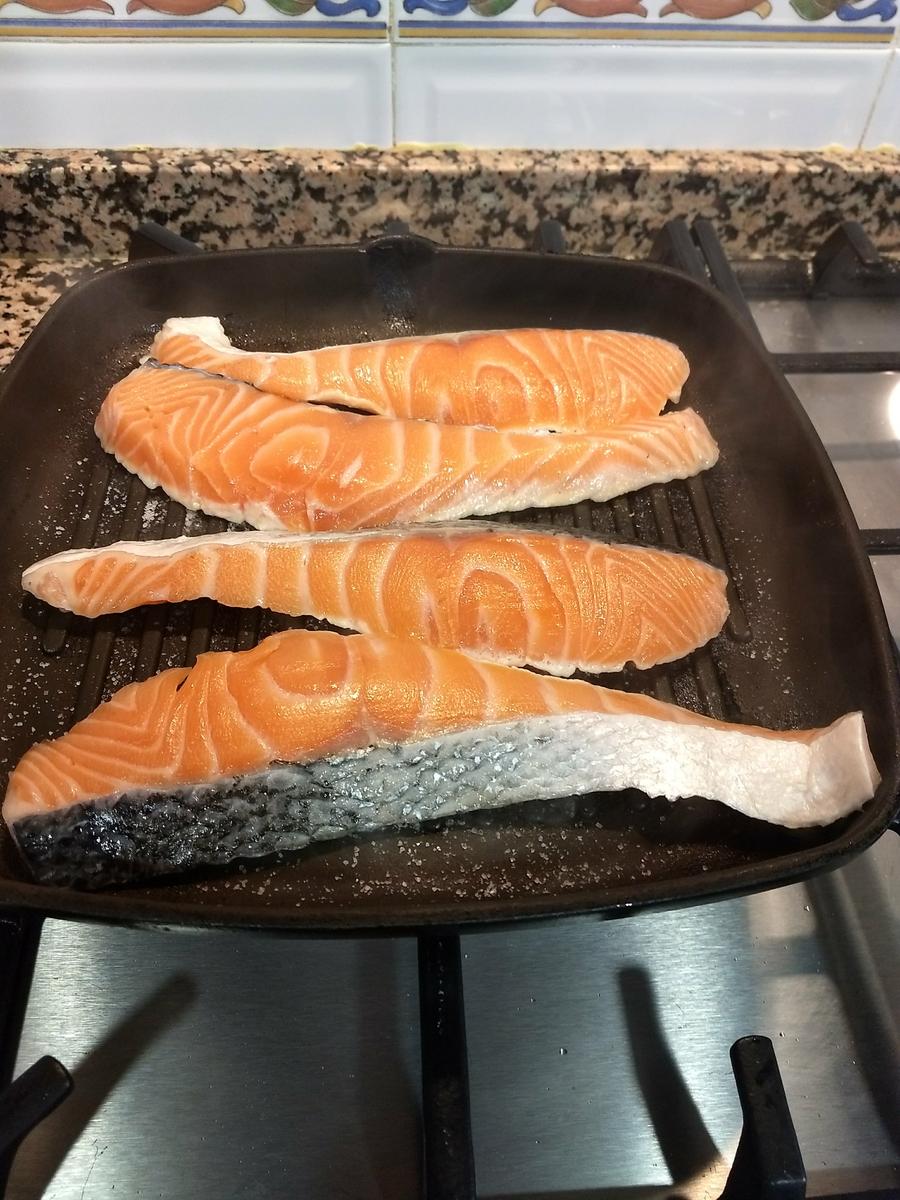 Aparte ponemos a calentar una parrilla SIN NADA DE ACEITE (el salmón desprende su propia grasa) a fuego fuerte. Cuando vemos salir un poquito de humo ponemos sal en la parrila y el salmón. Dejar un par de minutos a fuego medio y luego girar. Cocinar otros 2 minutos. (Los minutos pueden variar ligeramente según el grosor del filete. Vigilar atentamente ya que nos puede quedar crudo o demasiado reseco.