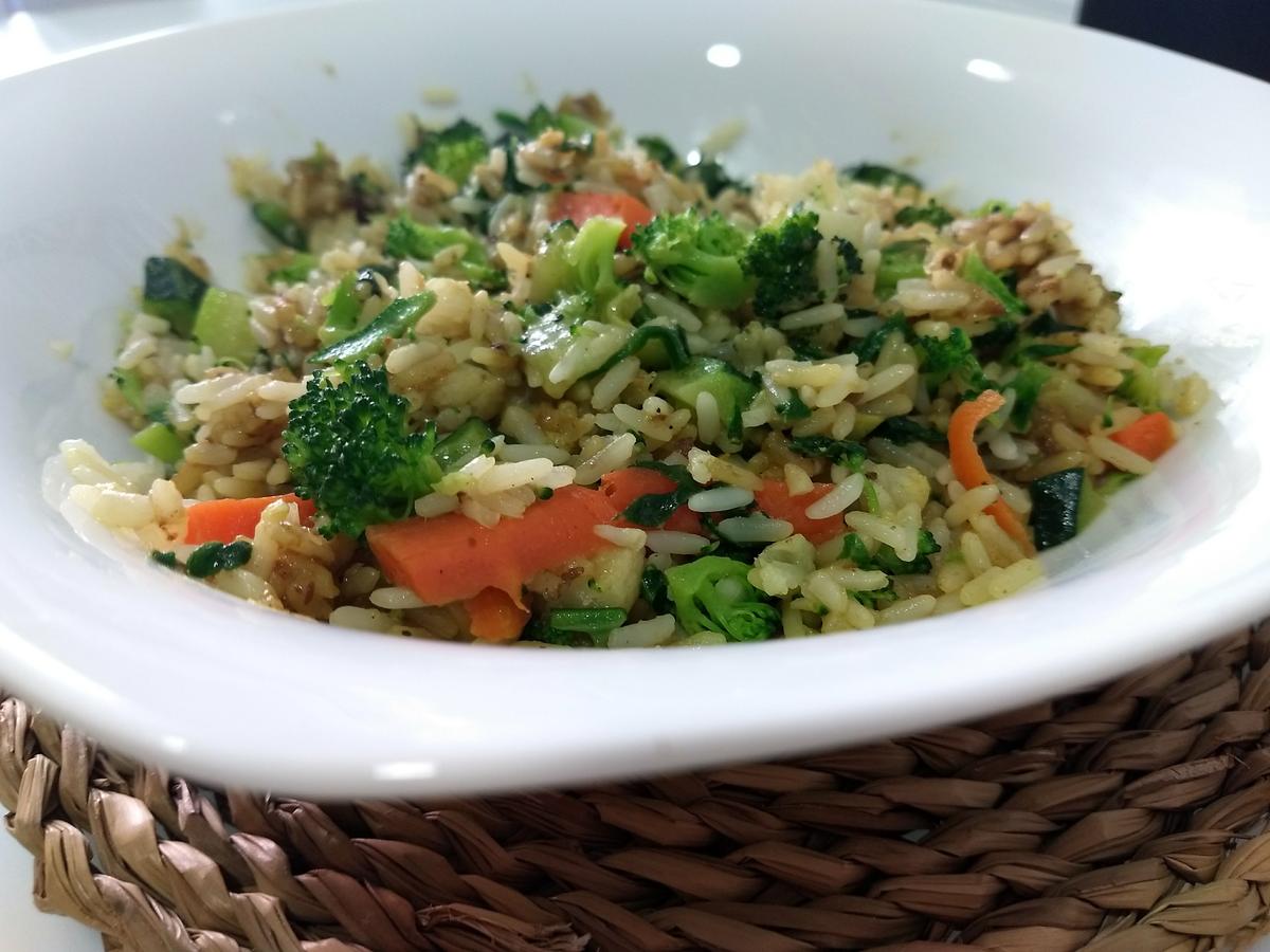 En una sartén añadimos con un poquito de aceite (muy poquito) las verduras cortadas y las salteamos un par de minutos minutos; añadimos un pelín de agua, salamos, dejamos reducir el agua, añadimos la cucharadita de curry, removemos y agregamos el arroz y salteamos unos minutos todo junto.