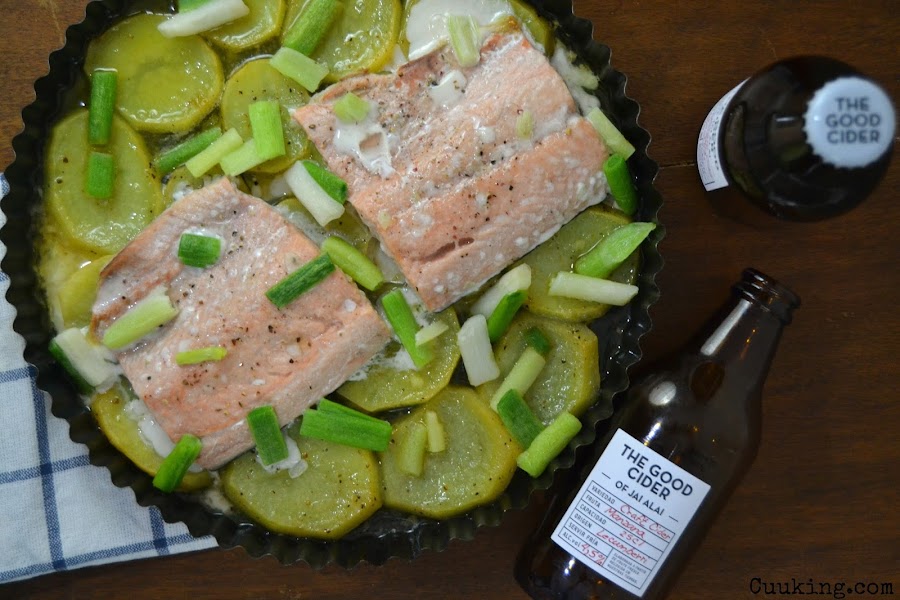 Ayer estaba organizando los armarios de la cocina y me encontré con el ultimo botellín de Sidra "The Good Cider Of Jai Alai" que recibí hace un par de meses con la Degustabox y de repente me vino la inspiración. Me acorde de esta receta que leí hace un tiempo en un blog (No recuerdo el nombre). Así que, me baje corriendo a la pescadera a por el salmón y lo prepare para comer ¡Estaba riquísimo