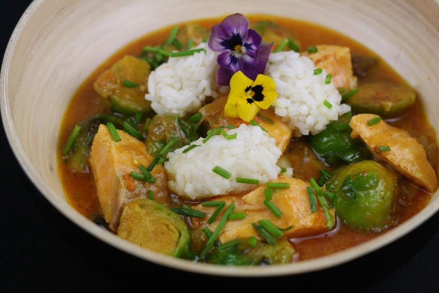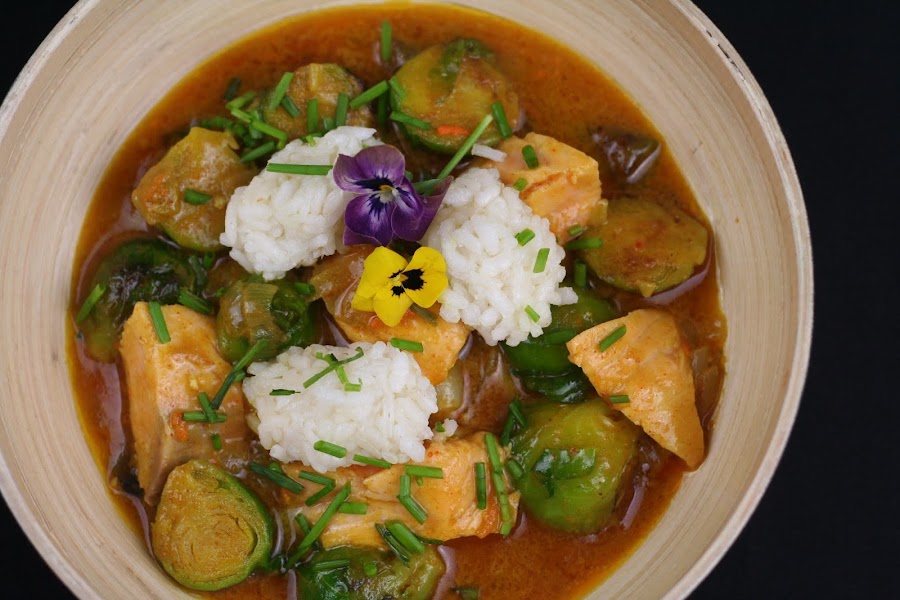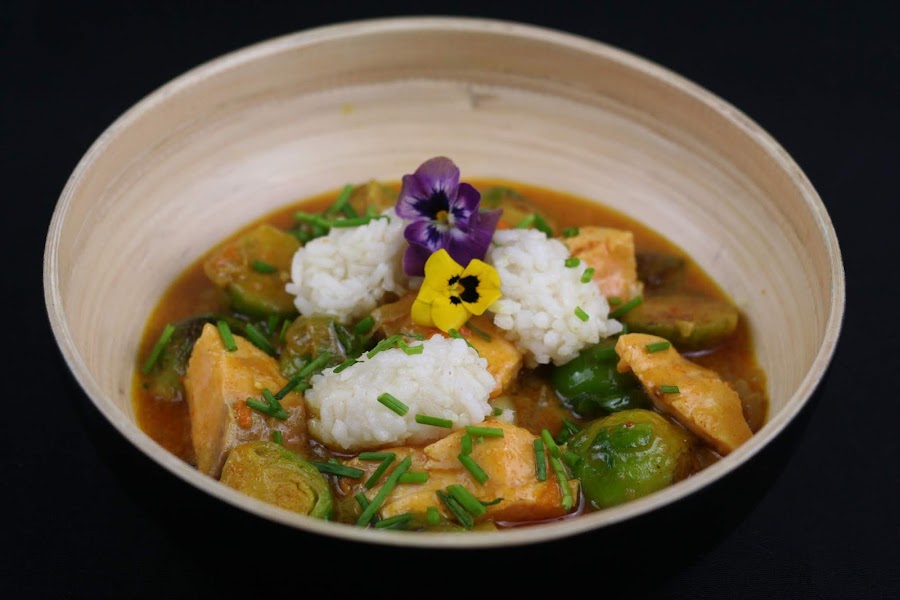 SALMÓN AL CURRY CON COLES DE BRUSELAS Y ARROZ