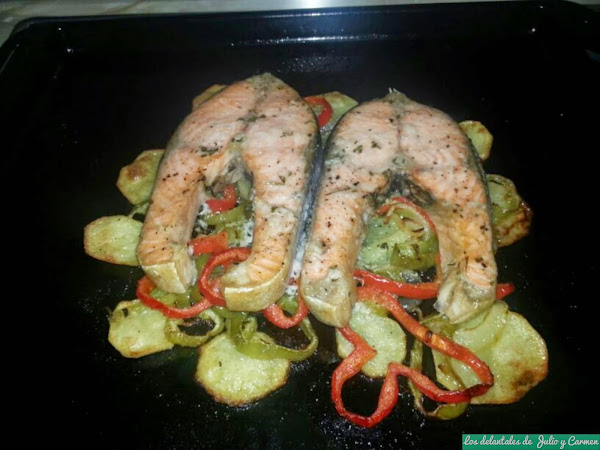 La receta que tenéis hoy aquí, es una forma muy sencilla y jugosa de preparar pescado, en este caso salmón, sin tener mucho tiempo para ello. A Carmen le gustó mucho (y eso que ella no es muy amiga de este tipo de pescado), así que animo a todos aquellos a los que no les gusta el salmón, a que prueben esta receta, que seguro les gustará y repetirán. Por mi parte no quiero entreteneros mas (que me lío a hablar y no paro..) y os dejo ya los ingredientes y los pasos a seguir. Solo una cosita mas...A ponerse el delantal y rumbo a la cocina!