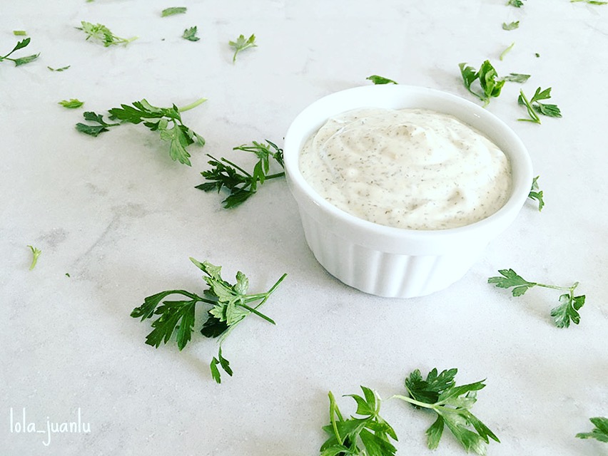 El eneldo siempre combina muy bien tanto con el salmón como con las patatas, así que la salsa que hemos preparado le da más sabor a ambos ingredientes. Servimos la salsa en un recipiente con una cucharadita para que cada comensal se eche en su plato lo que desee.
