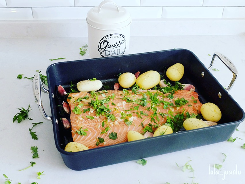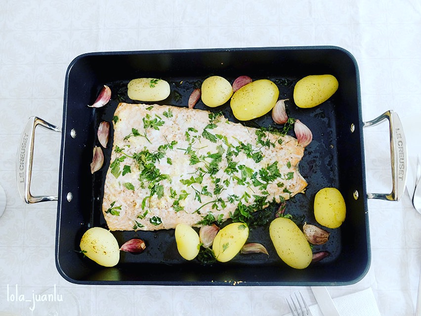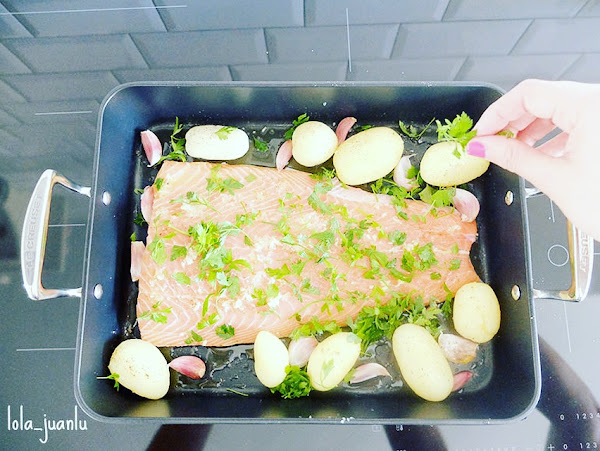 Horneamos a media altura durante 25 minutos o hasta que el salmón esté hecho y las patatas adquieran un tono dorado.