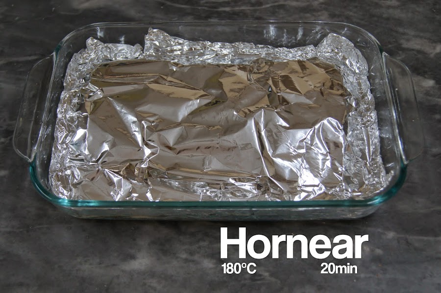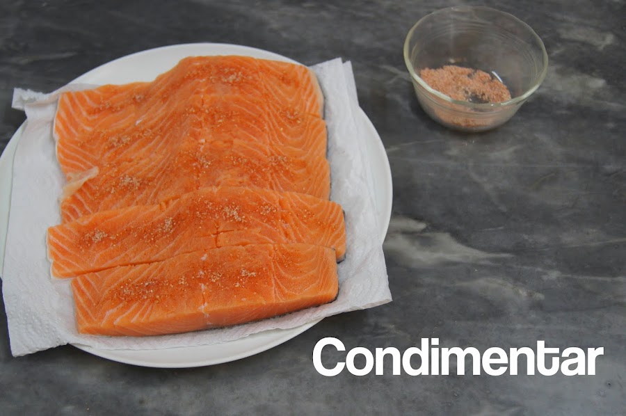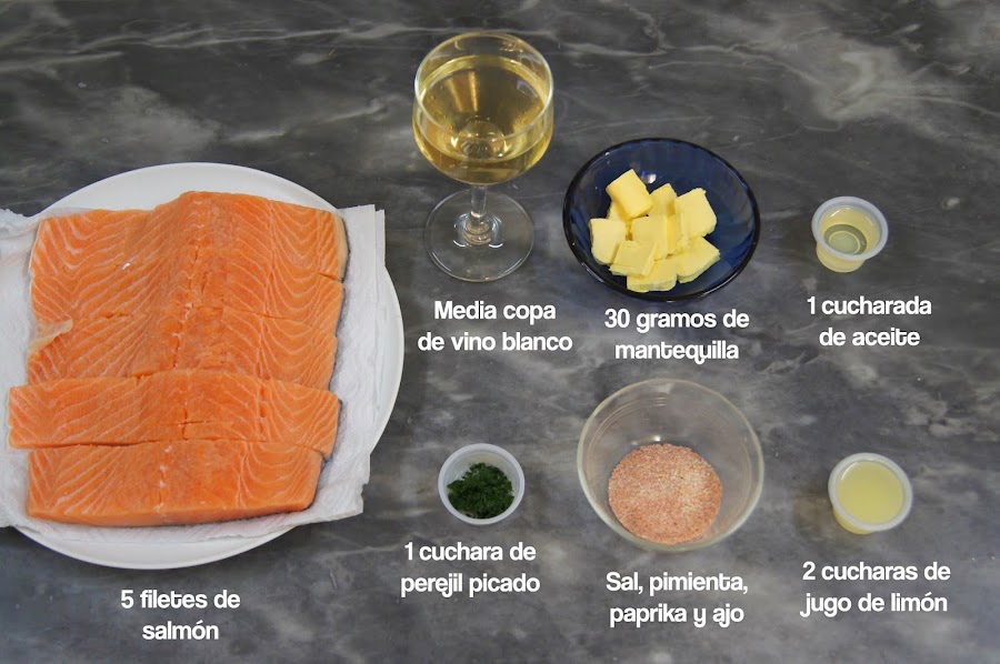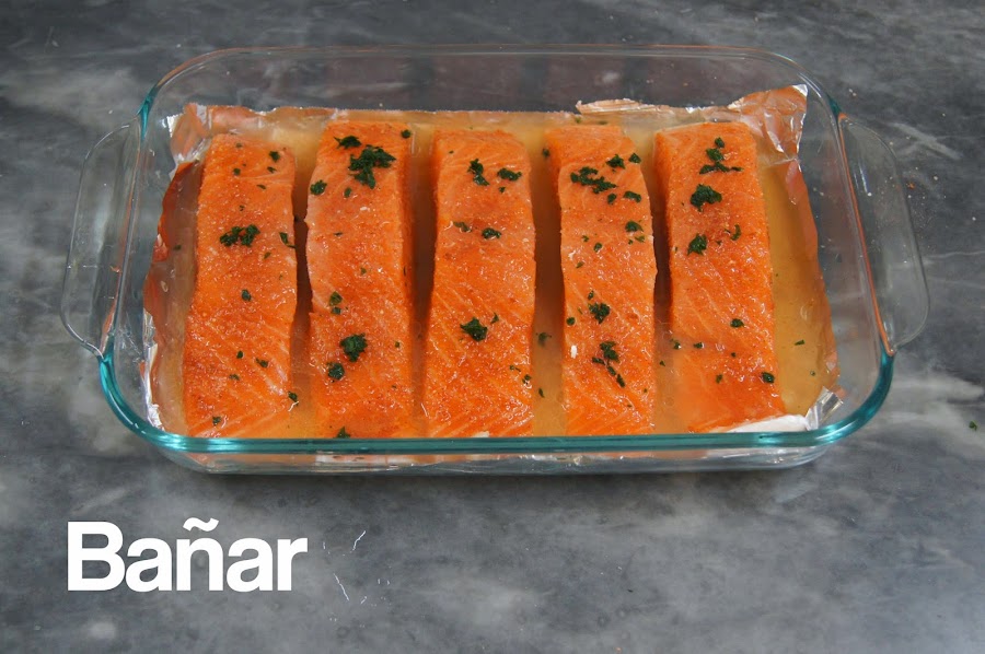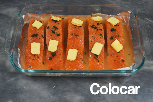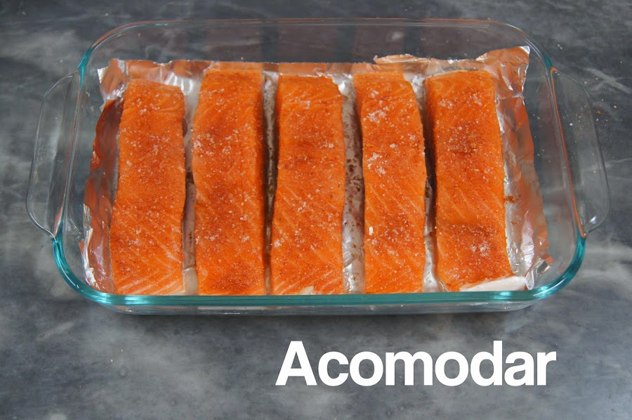 Mi mamá me encargó preparar esta receta para el almuerzo, es súper sencilla y puede estar lista, incluyendo el horneado, en menos de 40 minutos. El salmón puede ser reemplazado por otro pescado. Antes de hornearlo el pescado debe ser tapado con papel aluminio, tratando de juntarlo con el papel aluminio de la base para evitar que el liquido se salga y para que tenga más sabor. Yo lo serví con arroz y papas salteadas.