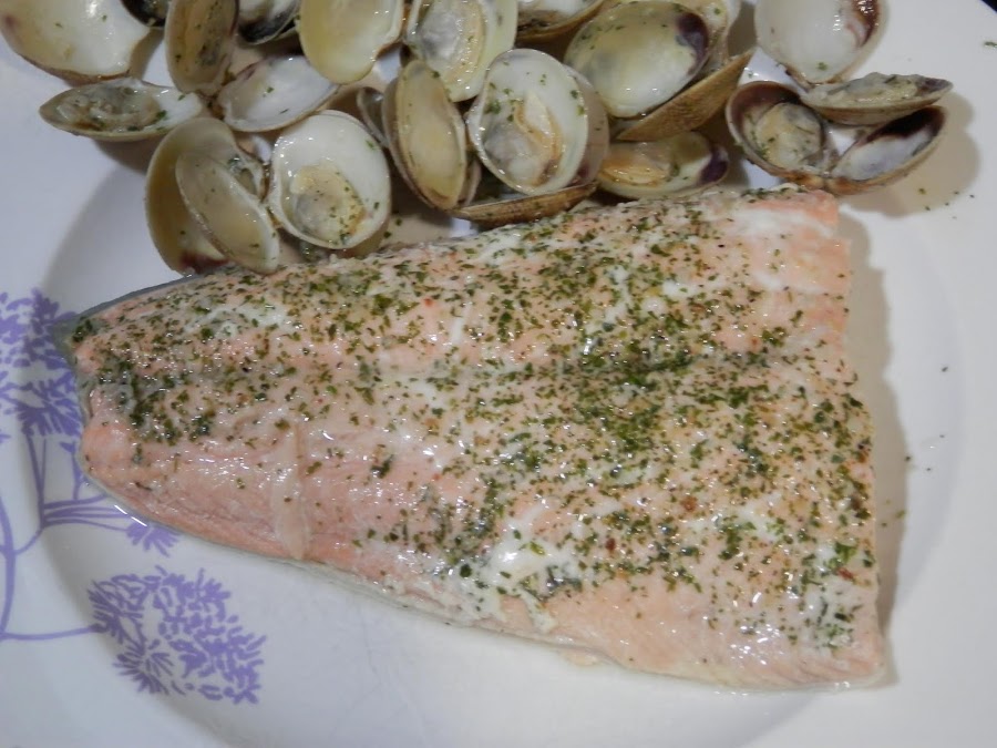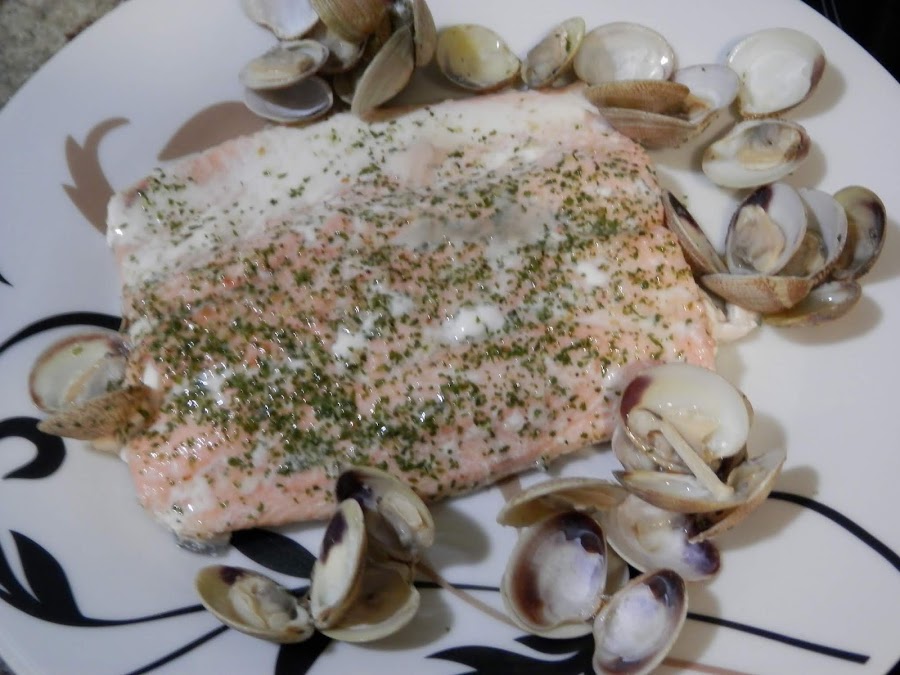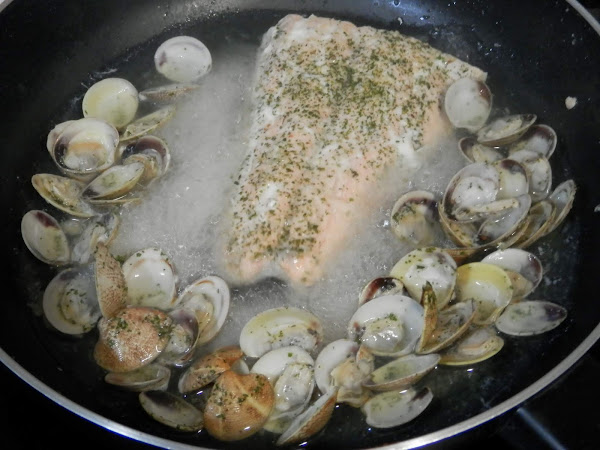 Cuando haya cambiado de color el salmón y las almejas se hayan abierto, estará, puede tardar un par de minutos.