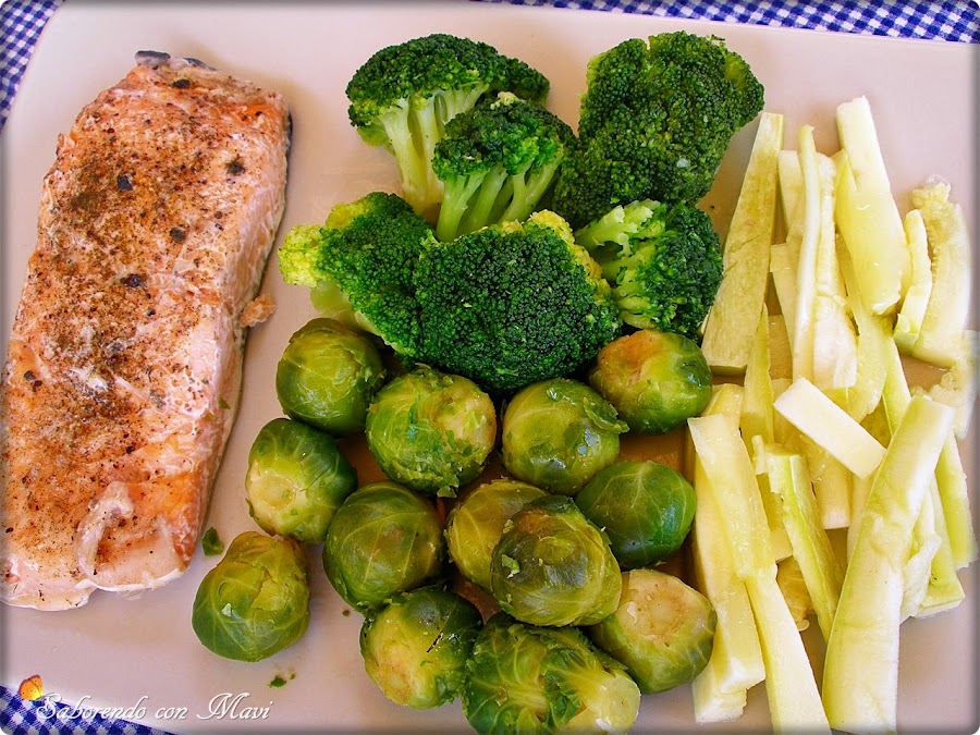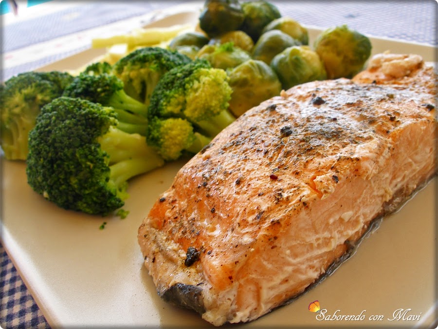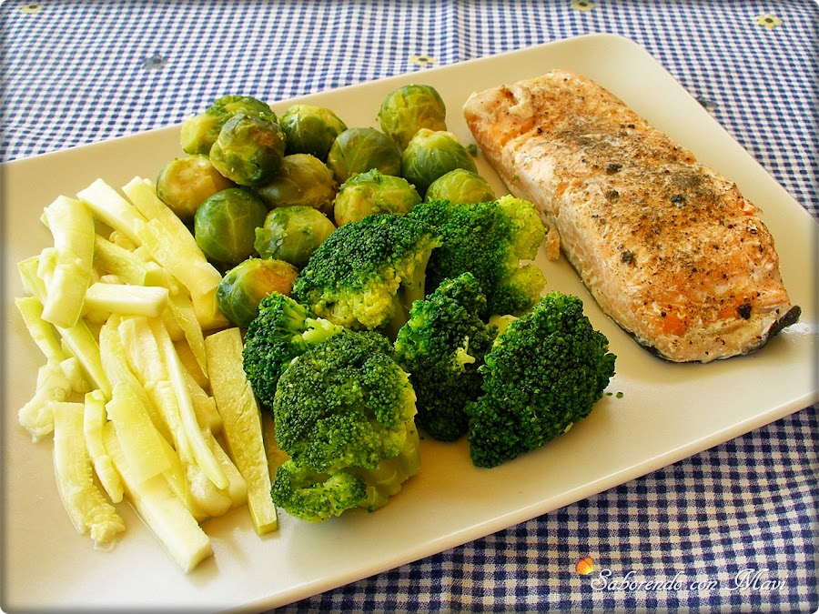 Seguimos utilizando el vapor para cocinar. Me he dado cuenta que los sabores se realzan a cocinar los alimentos al vapor, además es más sano y se utilizan menos aceites y conseguimos quitar unas cuantas calorías de nuestros platos. Este salmón lo preparé para dos personas, pero añadiendo dos trozos más comen perfectamente cuatro. No les preparé ninguna salsa pero se le puede añadir al gusto del consumidor.