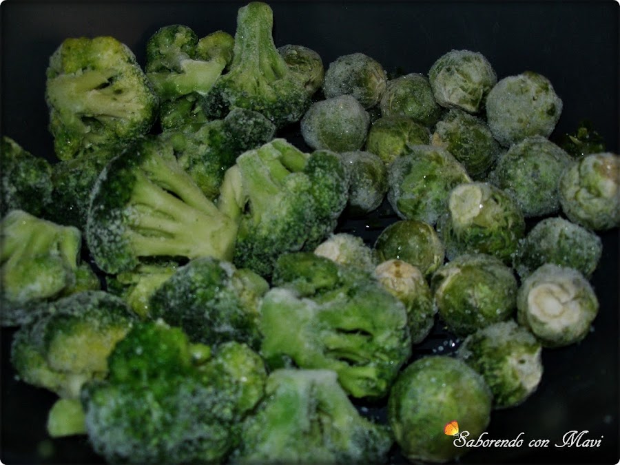 En la bandeja de abajo ponemos las coles y el brócoli, salpimentamos y rociamos con gotas de aceite. Yo aproveché y casque unas patatas y las puse en el cestillo para hacer un aliño.
