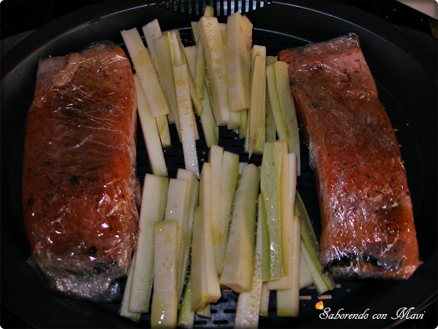 Cortamos el calabacín en bastoncitos finos y los añadimos a la bandeja con salmón salpimentando y rociando con unas gotas de aove.