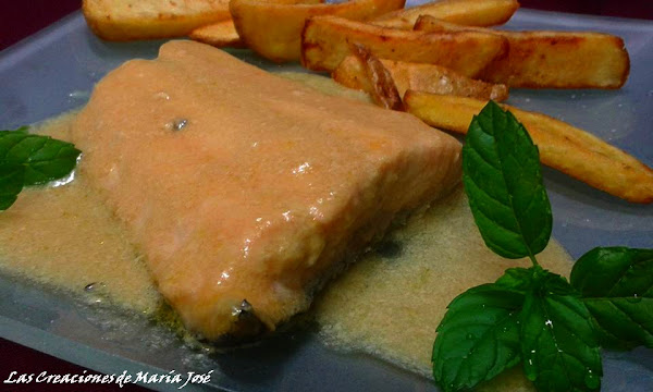 Echar en una sartén onda 3 cucharadas de aceite de oliva, cuando este caliente echar todos los líquidos poco a poco, la sal, la pimienta y la cebolla en polvo remover bien. Cuando empiece a hervir echar el salmón, bajar el fuego a la mitad hasta que este el salmón hecho que serán unos 10 minutos. Yo lo acompañe con unas patatas fritas y lo decore con hierbabuena. Os aconsejo hacer esta salsa con cualquier pescado os encantara.