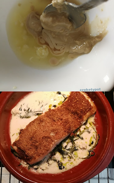 Pasados los 5 minutos, sacamos el salmón le ponemos la mezcla de tahini alrededor del salmón, y lo metemos otra vez en el horno otros cinco minutos, o hasta que el pescado esté bien cocido y el tahini esté hirviendo.