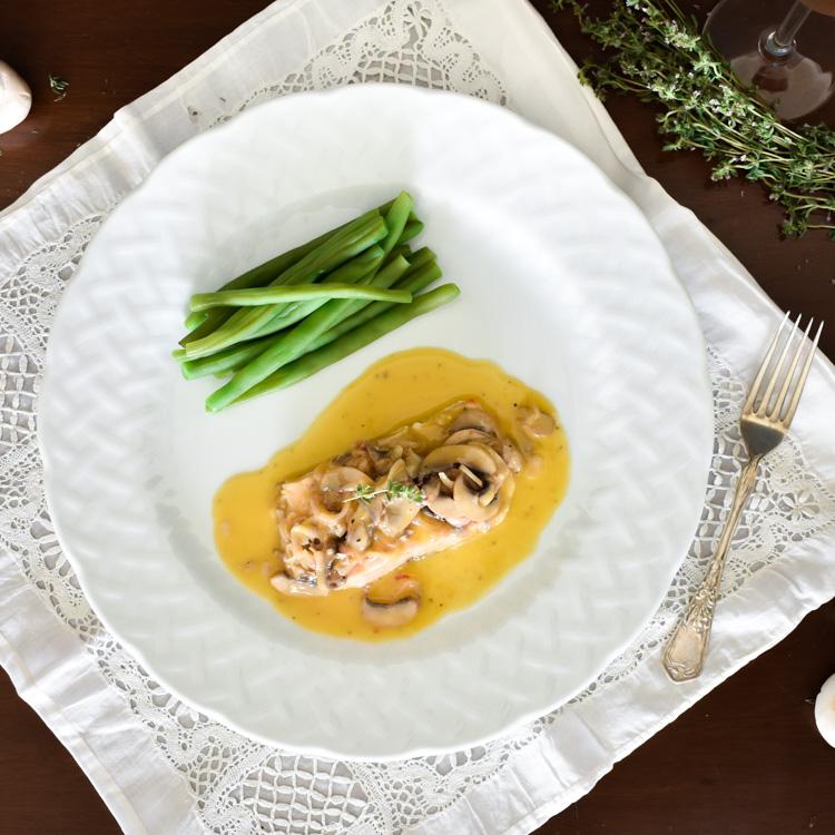 Por algo dicen los franceses que el secreto de la buena cocina está en la mantequilla. Este salmón au beurre blanc rosé, o salmón en salsa de mantequilla rosada, es la prueba perfecta de que no podrían estar más en lo correcto. El beurre blanc es una salsa básica de la cocina francesa; se prepara como una reducción a base de vino o vinagre y mantequilla. En esta ocasión, para hacer el salmón en salsa de mantequilla, cambiamos el vino por champagne rosé y agregamos echalotes y champiñones. Puedes sustituir el champagne rosado por cava, prosecco o cualquier vino espumante que tengas a la mano. Te recomiendo servirlo con verduras verdes al vapor y un poco de arroz blanco.