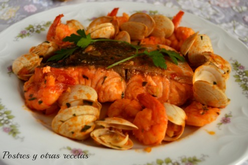Espolvorearlas con el perejil y añadirlas a la cazuela, con sus jugos junto con el salmón y las gambas. Proseguir la cocción durante 3 minutos y retirar del fuego.