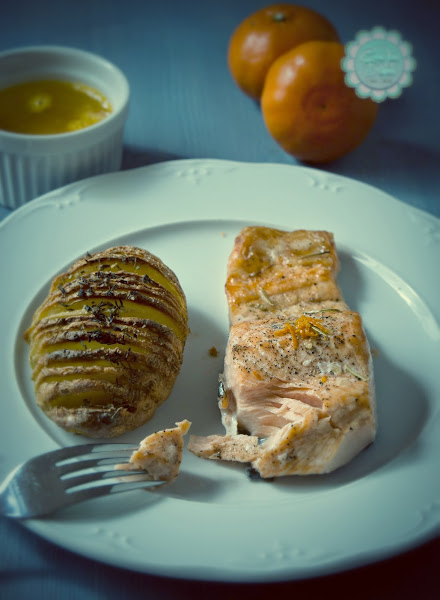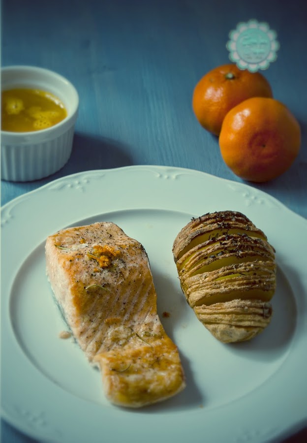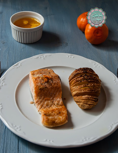 5) Servimos el salmón en un plato, en este caso, como guarnición preparé las patatas Hasselback que publiqué hace algunos meses. Ponemos el almíbar en una salsera de modo que cada comensal se ponga la cantidad que desee. A disfrutar!!!!!!!!!!!!!!!!!!!!!!!!!!!!!