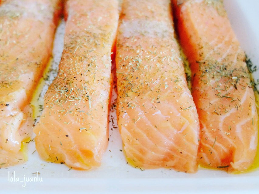 Mientras los gajos de batata se están haciendo en el horno, preparamos el salmón. Con ayuda de un papel de cocina o brocha, extendemos un poco de aceite de oliva virgen extra por la base de una fuente de horno, colocamos los filetes de salmón, salpimentamos y espolvoreamos un poco de eneldo por encima, rociamos con un chorreoncito de aove y horneamos durante 20 minutos.