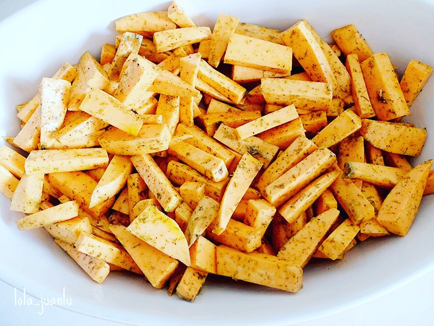 A continuación, lavamos y secamos bien el boniato, lo pelamos y lo cortamos a gajos. Introducimos en un bol los gajos de batata y añadimos el aceite, las especias, la sal y la pimienta. Removemos y vertemos el contenido en una fuente de horno. Llevamos al horno y horneamos durante 20 minutos a una altura media alta. Transcurrido este tiempo, removemos y volvemos a hornear durante otros 20 minutos. Una vez hayan pasado los últimos 20 minutos, cambiamos a la función grill y doramos los gajos de boniato durante 5 minutos más.