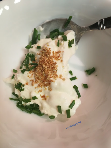 Mientras en un cuenco ponemos la crema agria con yuzu al gusto, para darle un toque cítrico, también le podéis poner ralladura de lima y cebollino picado.