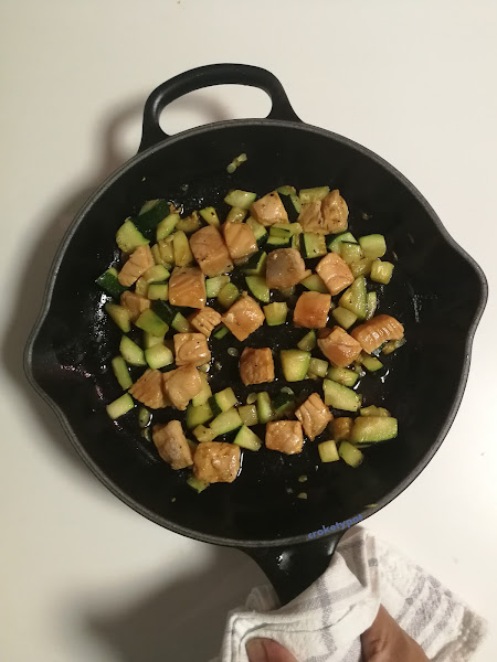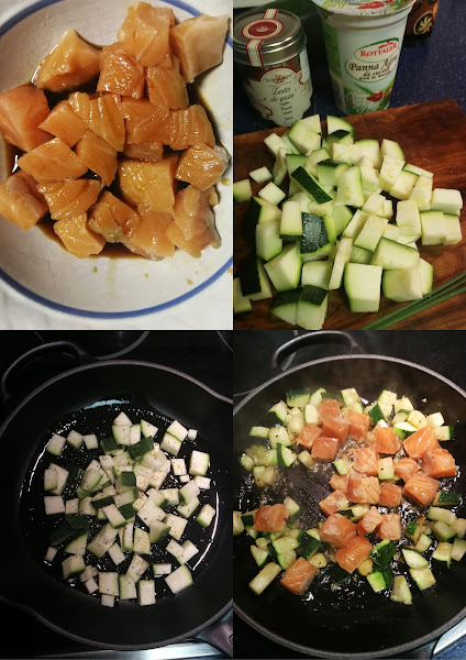 ELABORACIÓN: Cortamos a dados el salmón y lo maceramos en salsa de soja 15 minutos, cortamos el calabacín a dados. En una sartén ponemos un poco de aceite, salteamos el calabacín con sal y pimienta 3 ó 4 minutos.