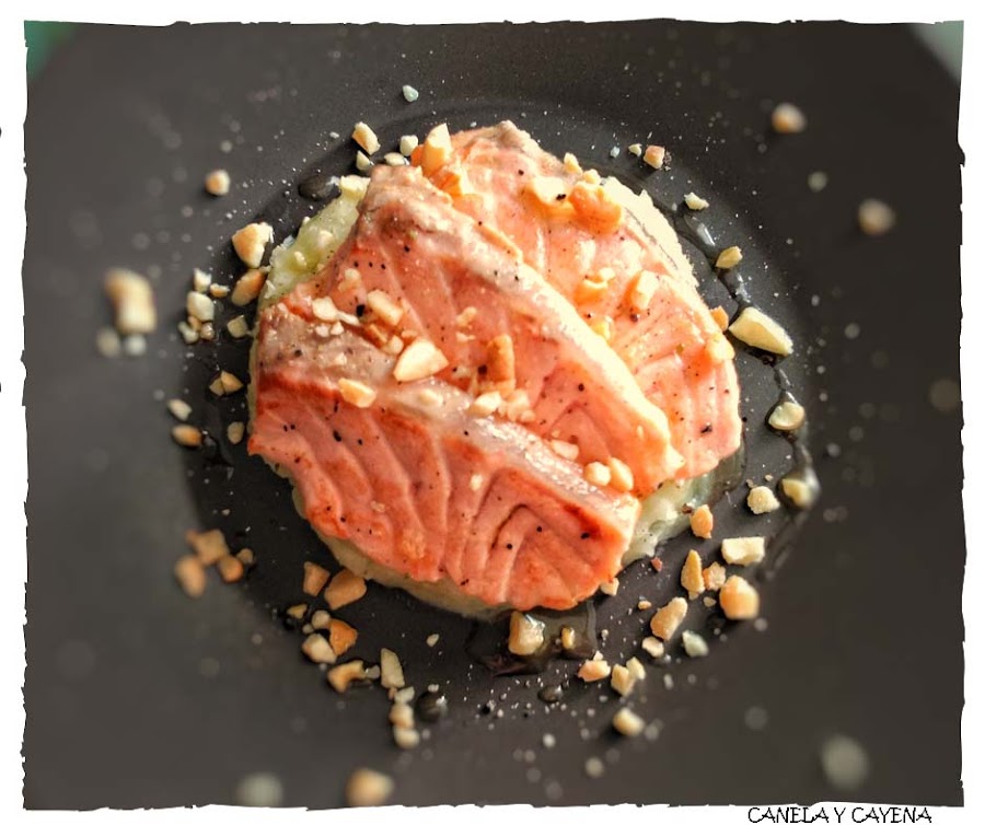 ¡Hola cociner@s! Si estos días de fiesta te has excedido un poco y quieres volver a los platos saludables sin renunciar al sabor, hoy te traigo una receta imprescindible para ti. Se trata de salmón en cama de patata con crujiente de anacardos y aceite aromático. Delicioso, ligero, fácil y rápido de hacer.
