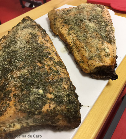 Cocinaremos en la parrilla por 20 minutos aproximadamente a 180º, el tiempo dependerá un poco del gusto de los comensales, aquí en España les gusta el salmón menos hecho. En una parte de la parrilla pondremos una bandeja de aluminio con agua para que le aporte humedad.
