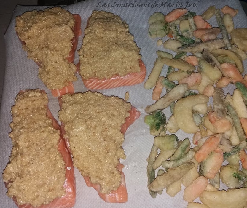 Yo acompañe el salmón con unas verduritas en tempura, que compre en el mercadona y que se hace al horno.
