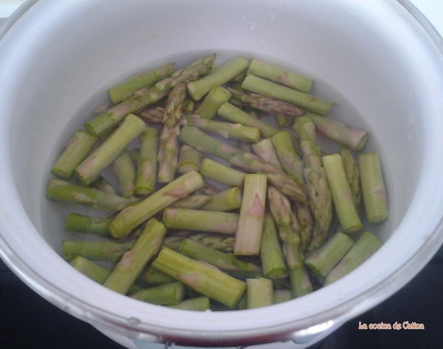 Trocear los espárragos, en una cazuela con agua y sal, les damos un hervor, escurrimos y reservamos.