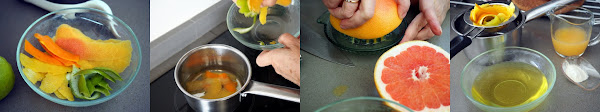 Pelar, con cuidado de no cortar la parte blanca, una parte de los cítricos anteriores. Exprimirlos en el mismo recipiente, mezclar y retirar los 25 gramos de zumo necesarios, reservar.
