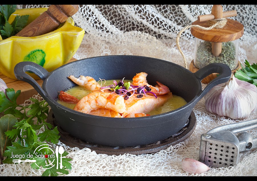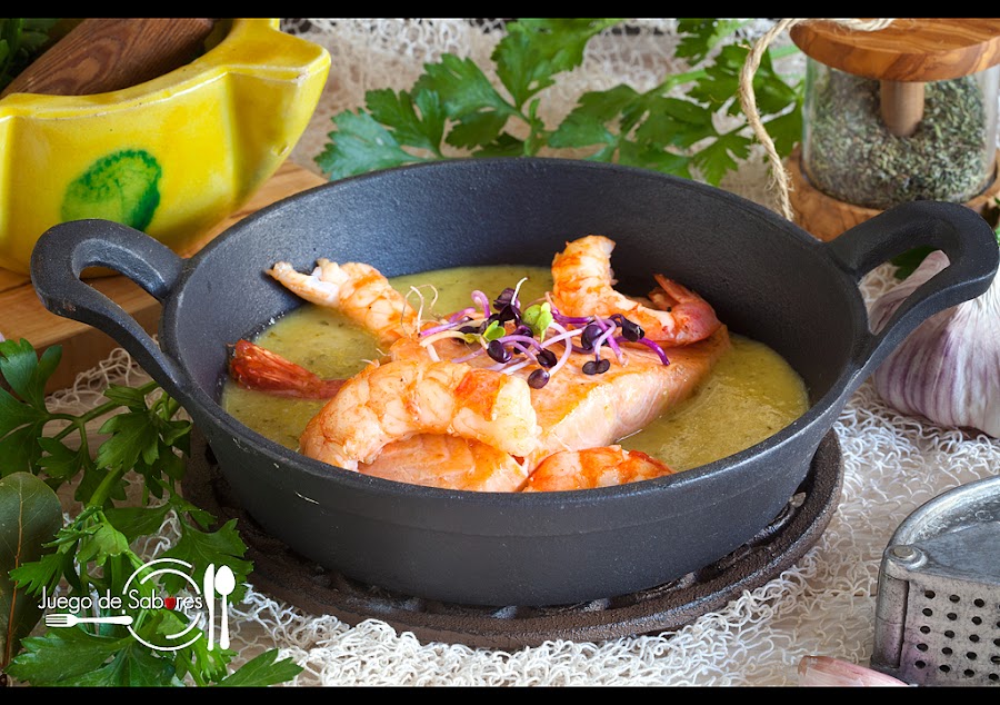 Salar el salmón y poner los lomos en la cazuela junto con las gambas.