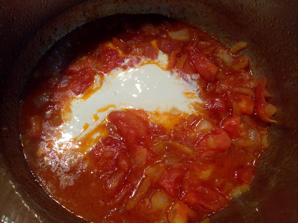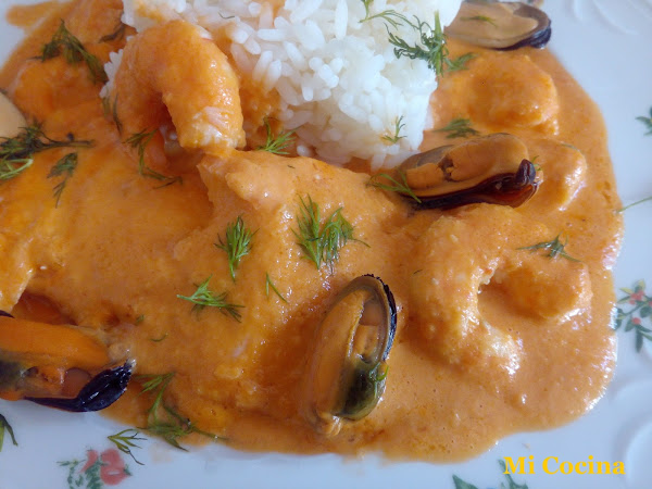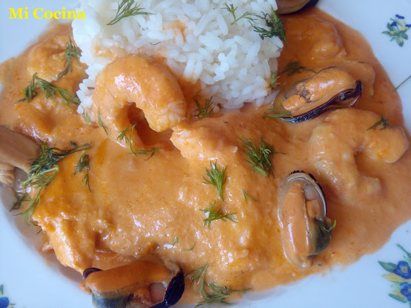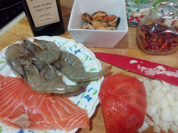 un tomate, media cebolla blanca (tipo cebolleta), 8 mejillones cocidos y medio vaso de su caldo (EN ESTE ENLACE aquí pueden ver como prepararlos), 6 langostinos, una guindilla roja (pimiento chile pequeño), un vaso de caldo de pescado (suelo hacerlo con espinas de rosada e incluso con la piel del salmón) , un vaso de nata (crema de leche) especial para cocinar, sal y aceite de oliva virgen extra.