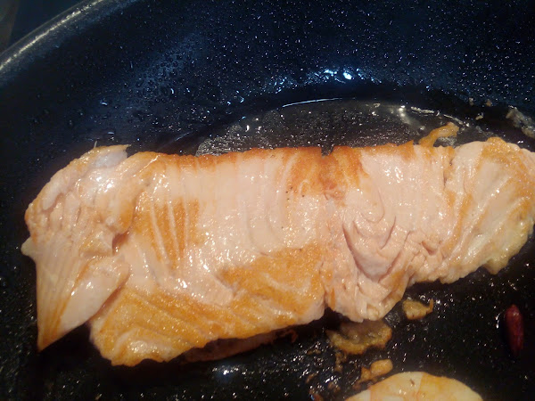 Una vez caliente el aceite colocar el salmón y los langostinos en ella, salar y dejar hacer primero por un lado.