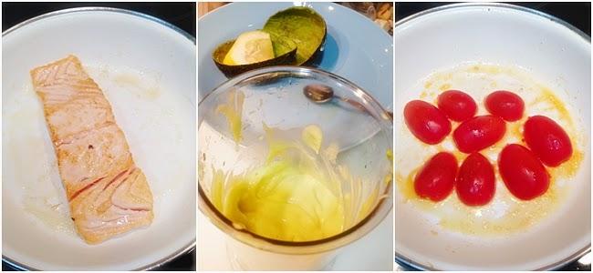 En el mismo aceite marcamos los tomates cherry cortados por la mitad y los reservamos para el final.