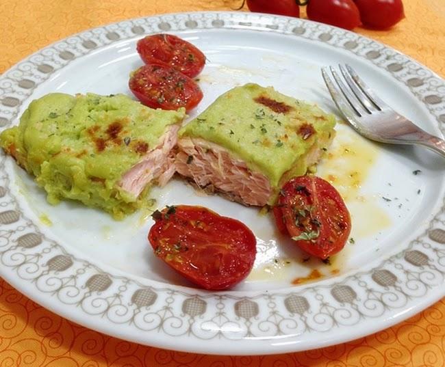Cubrimos los lomos de salmón con el mojo de aguacate y espolvoreamos con queso parmesano (opcional) o bien lo pincelamos con un poco de leche.