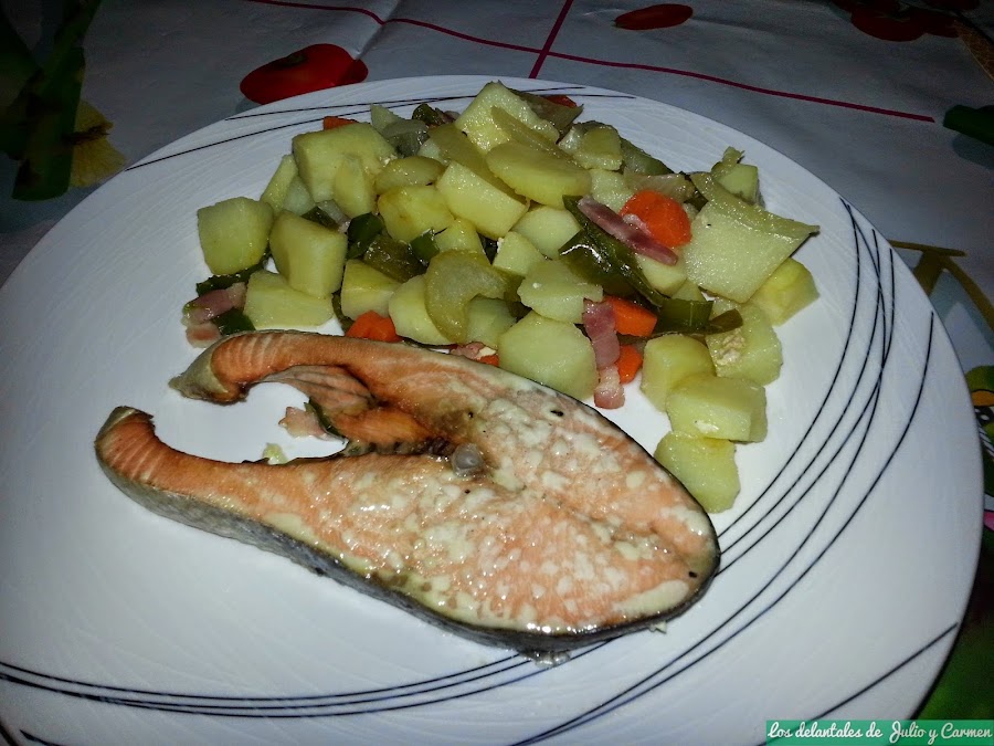 El salmón. Para mi uno de los pescados mas ricos y sabrosos que he probado. Carmen, sin embargo, no es de la misma opinión, ya que bien es cierto que hay que tener especial cuidado con las espinas para no llevarnos un susto, pero esto sucede con cualquier pescado. Pese a ello, en casa solemos preparar recetas con salmón, como la que ya publicamos hace un tiempo de salmón al horno con base de patatas y pimientos, y es que este pescado, con una buena base, y ya sea al horno o a la plancha, a mi me resulta delicioso.