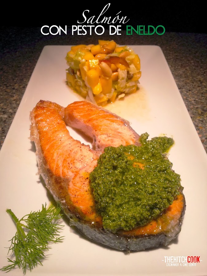 El salmón es uno de esos pescados tan socorridos y vitales en la cocina, que ya es difícil sorprenderle. Nosotros vamos a intentarlo. Ya hemos preparado varias versiones para los amantes de este solicitado pescado azul (Salmón con Salsa de Naranja, Salmón Crujiente sobre Ensalada Tártara, Hamburguesa de Salmón con Salsa de Pepino...) así que hoy toca reinventarse. Lo hacemos de una manera clásica - a la plancha - pero lo maquillamos con un sabrosísimo pesto de Eneldo, que le va que ni pintado. Para refrescar el plato nada mejor que una buena ensalada de Mango y ya tenemos lista la nueva incursión.