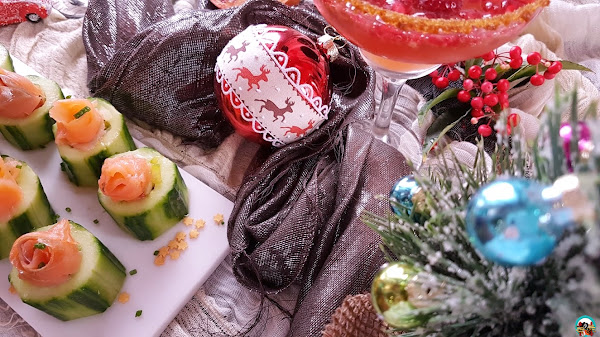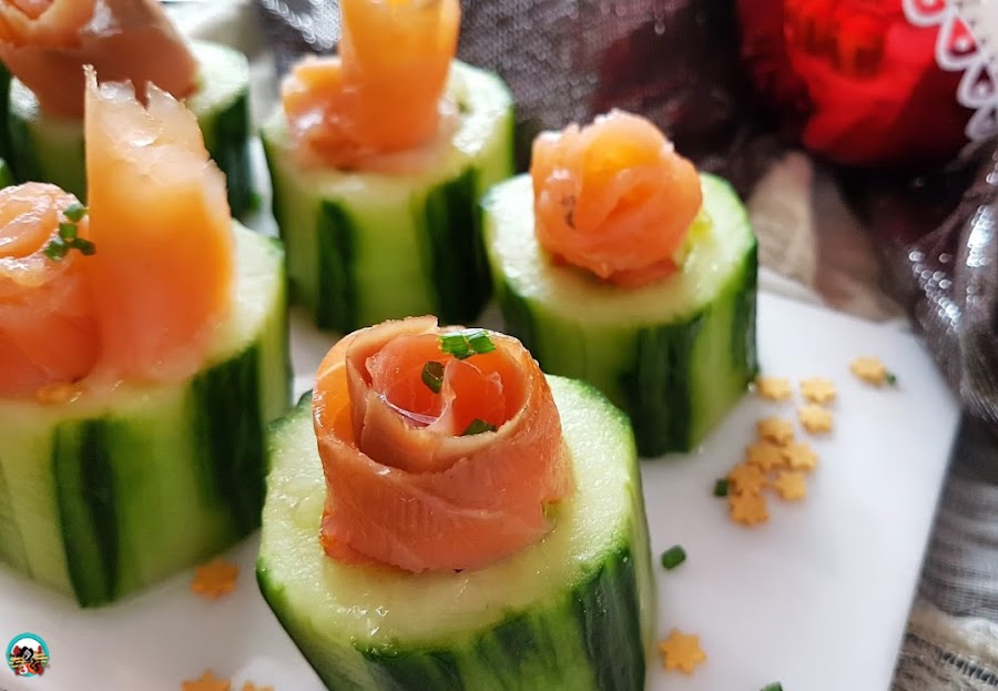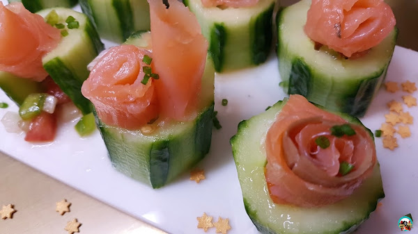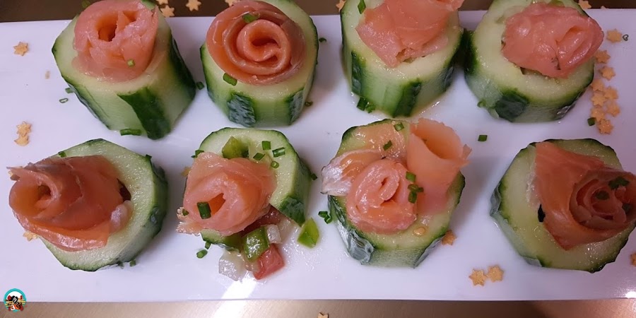2.- Rellenamos cada trozo de pepino con un poco de pipirrana, lo hacemos con la ayuda de una cuchara de café. Sobre cada pepino colocamos una loncha pequeña de salmón enrollada sobre sí misma, para darle forma de flor. Picamos un poco de cebollo fresco, lo esparcimos sobre el salmón con la pipirrana. Guardamos en un táper hasta el momento de servir.