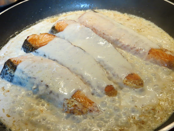 Seguimos con la misma sartén, donde freiremos las pieles y cabezas de las gambas hasta que queden buen doradas, cuando estén, añadimos la leche evaporada, esperamos hasta que hierva unos minutos, sacamos y colamos sobre el salmón que teníamos reservado, lo dejamos al fuego unos minutos.