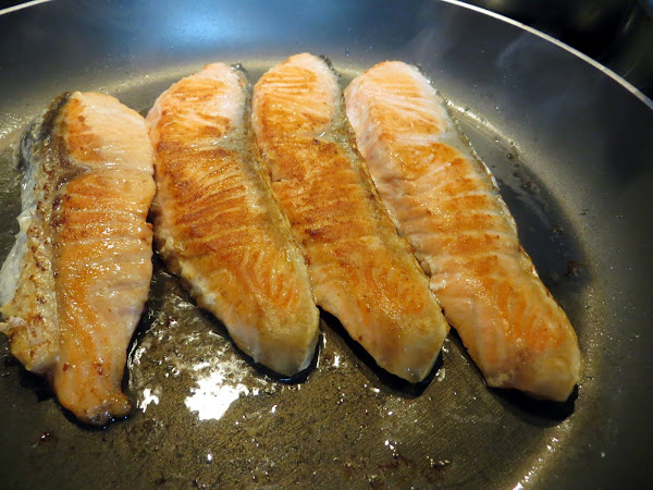 Ponemos una satén al fuego con unas gotas de aceite, asamos el salmón y reservamos en otra sartén.