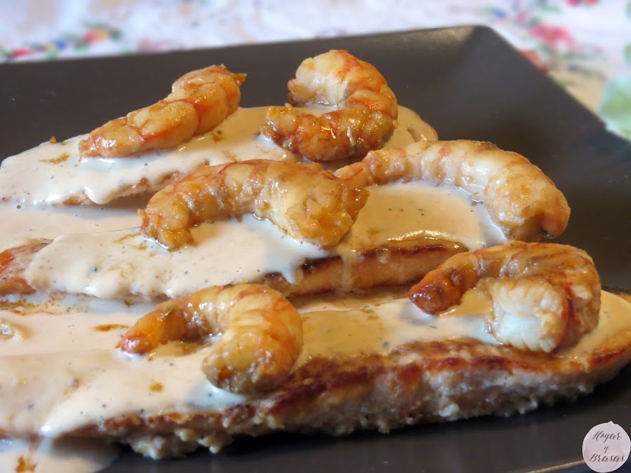 Servimos acompañado de la salsa y las gambas espolvoreado con pimienta.