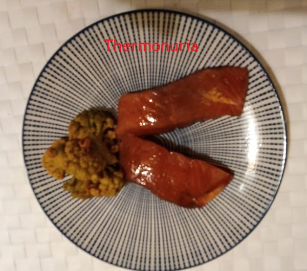 Sacar el salmón de las bolsas y ponerlo en el plato caliente con la salsa que quedara en las bolsas y la guarnición elegida, en este caso un romanesco al vapor.