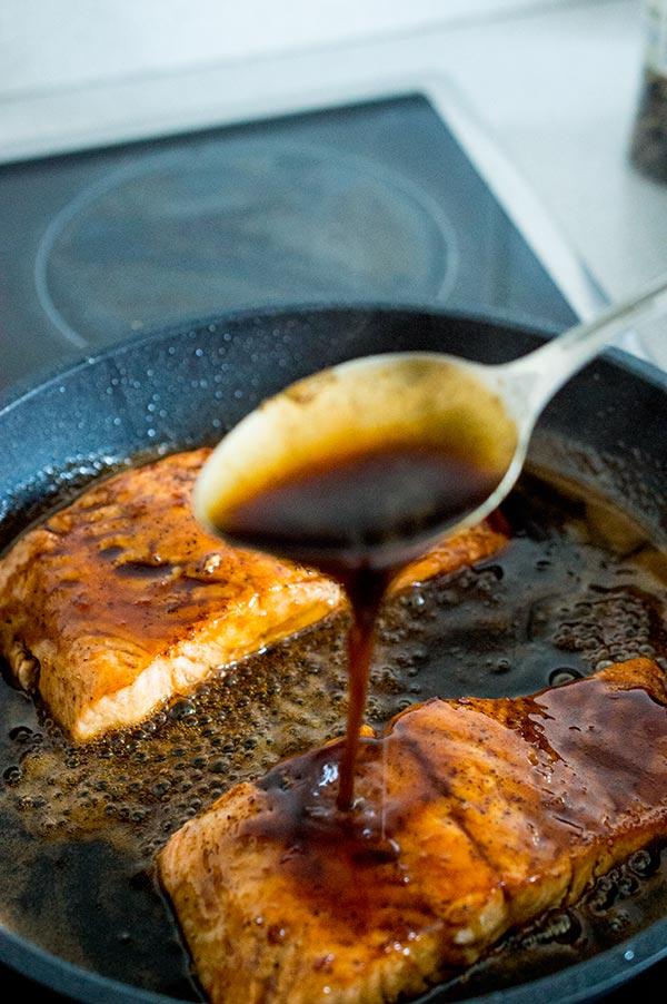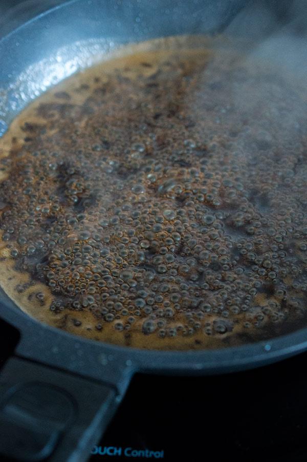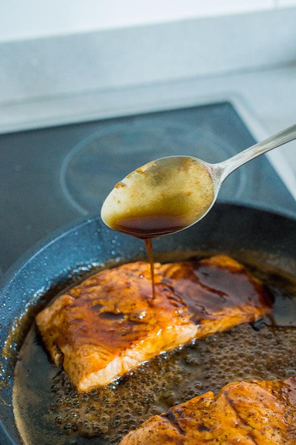 Dejamos que se cocine unos 5 minutos a fuego fuerte hasta que vaya engordando. Probamos para saber si los sabores están equilibrados ya que tal vez nos haga falta añadir un poco mas de miel o salsa de soja.