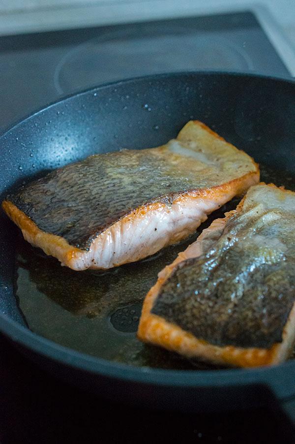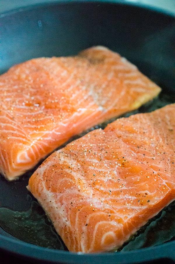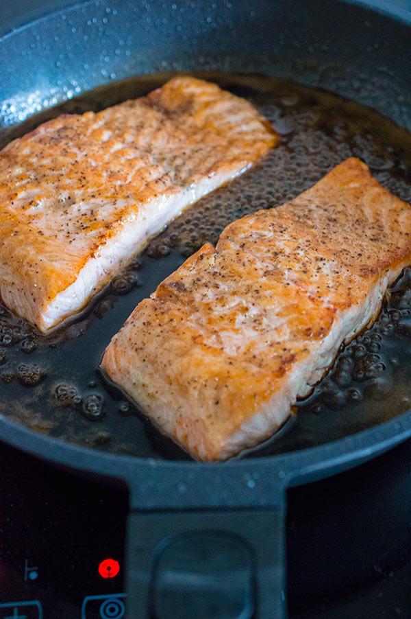 Salpimentamos el salmón y ponemos un chorrito de aceite en una sartén a fuego medio fuerte. Cocinamos por el lado de la piel 5 minutos.