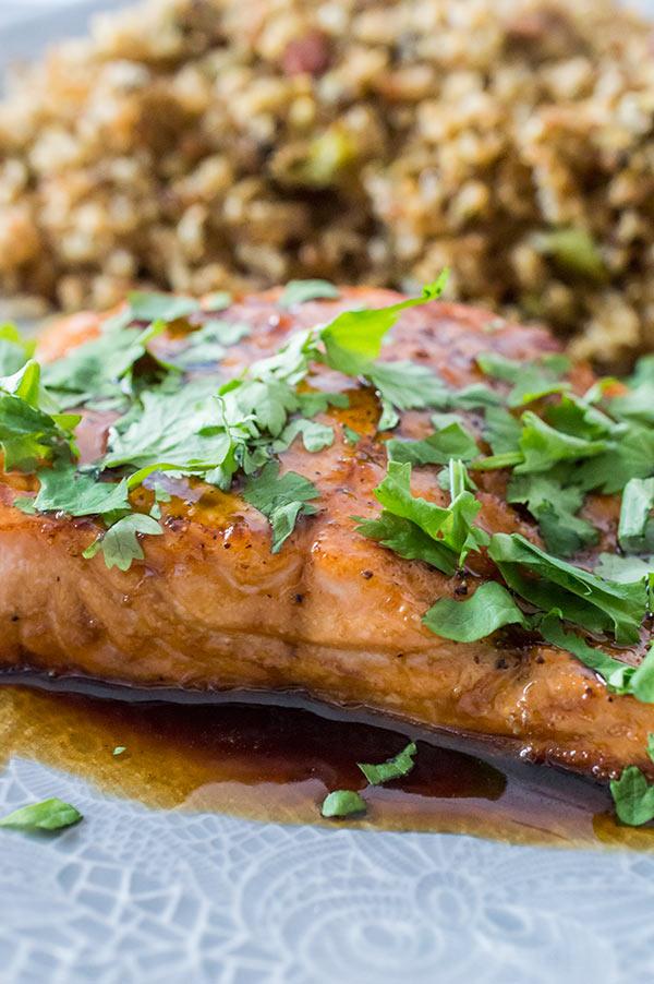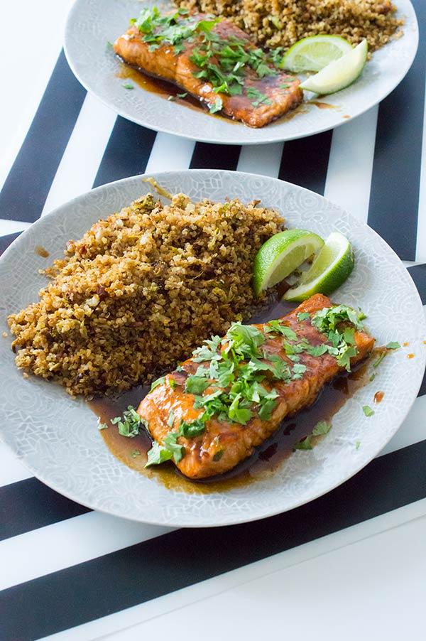 Hemos acompañado el salmón con un clásico de nuestro blog! Quínoa salteada con brócoli, pero tu puedes usar un simple arroz blanco que también le va perfecto!