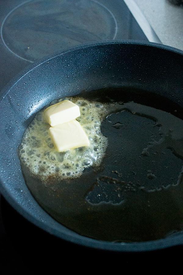 Sin retirar el aceite añadimos la mantequilla, junto con la salsa de soja, la miel y el zumo.