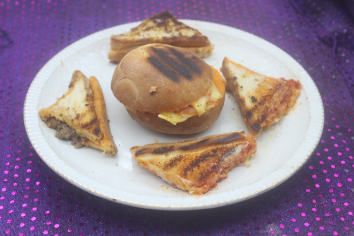 Colocamos en el grill doble cerrado, tanto los panecillos de hamburguesa, como los triangulitos de pan de molde durante 5-10 minutos.