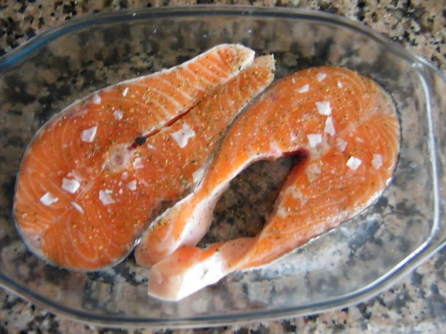 2. Salpimentamos el salmón. También podemos usar ajo en polvo, perejil... Lo metemos al horno precalentado a 200º. El salmón es un pescado graso, así que yo no añado aceite ni mantequilla.
