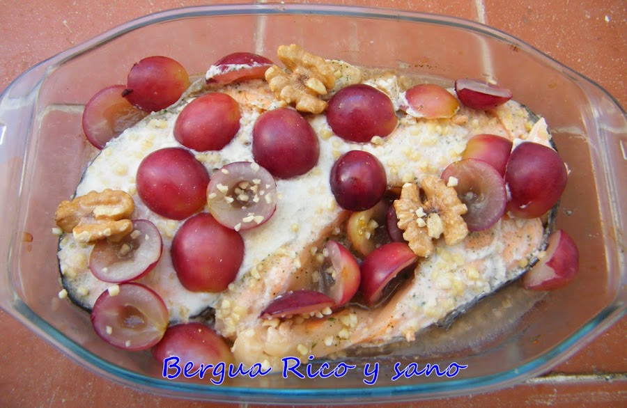 El otro día me apeteció un hervido de los de toda la vida, con sus bajocas o judías, su patata y zanahoria, pero sobre todo, su aceitico de oliva. De pequeña, mi madre me lo hacía sobre todo para acompañar al salmón y, por guardar la tradición, eso mismo he hecho yo. Pero porque también es bueno innovar, hemos probado el salmón al horno con uvas, almendra y nuez y un chorrito de vino blanco, que se puede cambiar por un chorrito de zumo de uva y unas gotas de limón. La idea de las uvas me la dió bilyrecetas. Para 2: