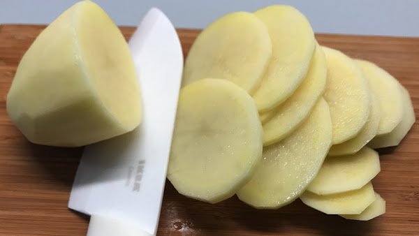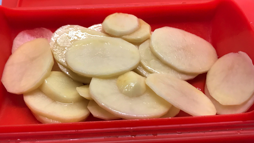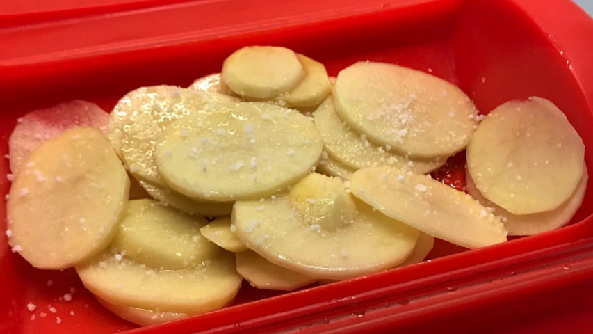 Introduce las patatas en rodajas y sazona. Mezcla.