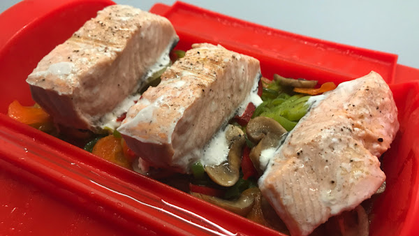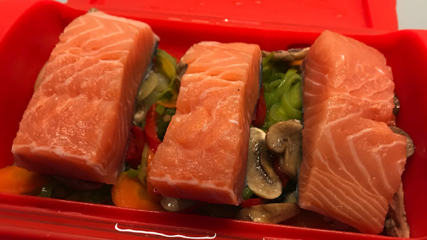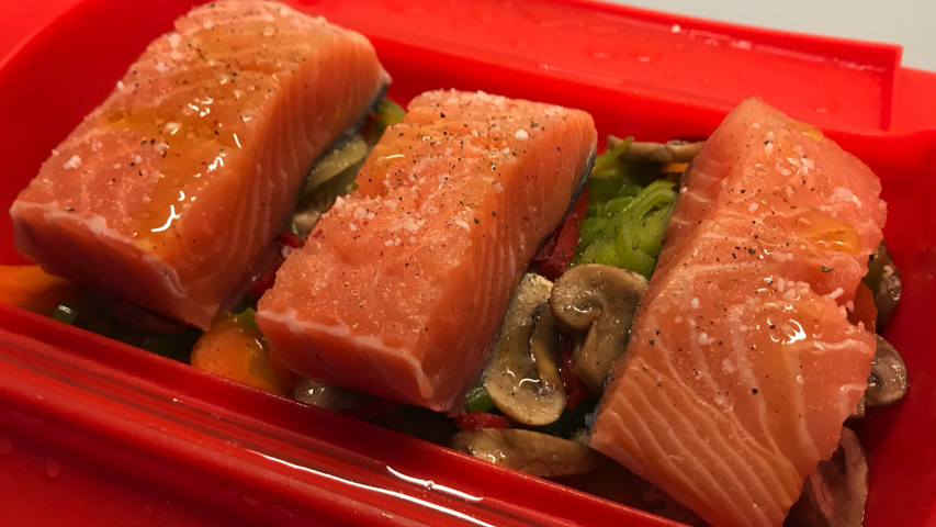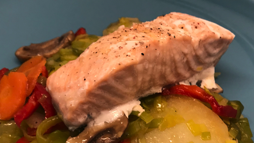 Coloca el salmón sobre la verdura. Salpimienta y añade unas gotas de aceite de oliva sobre cada trozo de salmón.