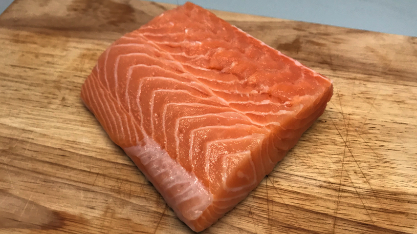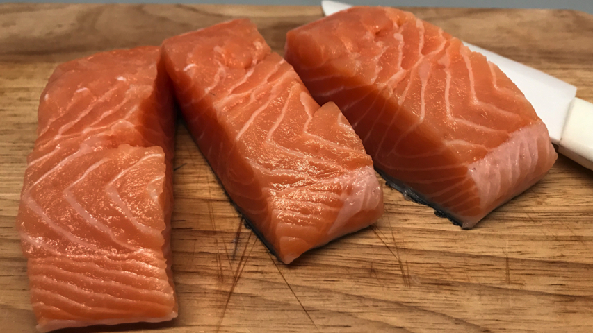 Limpia el salmón. Retira las espinas. Corta en porciones de unos 2 cm de ancho.